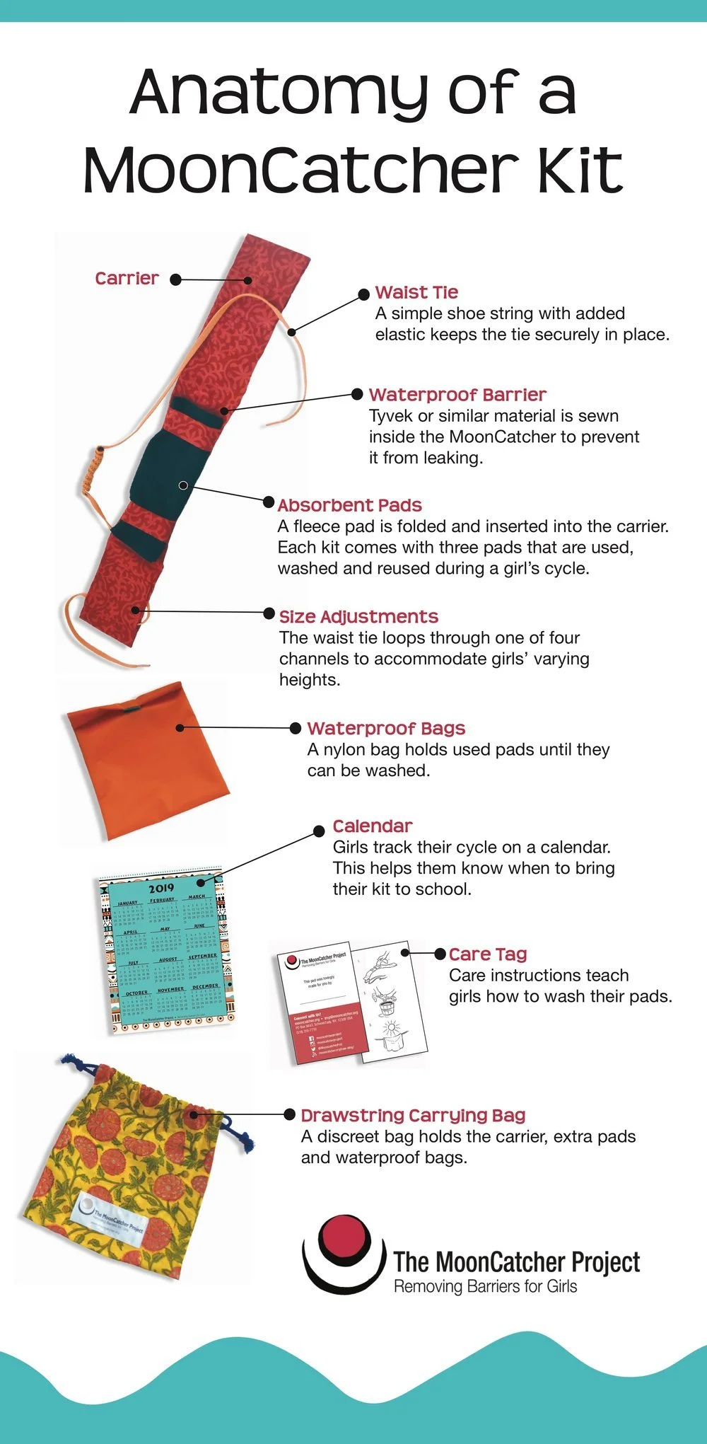 “Since 2011 The MoonCatcher Project has been making reusable, washable menstrual management kits - "MoonCatcher Kits" - for distribution to girls around the world, along with a menstrual and reproductive health curriculum. We provide the information and supplies they need to manage menstruation with dignity and confidence, increasing their chances of staying in school. Every person should be able to participate in their education and community life every day of the year.”